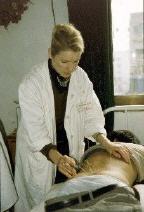 Ich war in der ambulanten Abteilung bei Dr. Xiao eingeteilt. Welcher als Spezialist auf dem Gebiet der Orthopädie gilt. Bei seinem Assistenten Dr. Liu konnte ich mir Techniken in der Tui Na Massage und der Chirotherapie aneignen. Oft wurde die Tui Na Massage oder die Chirotherapie vor oder nach einer Akupunkturbehandlung eingesetzt. Ein Behandlungszyklus in China umfasst etwa 4 Wochen mit jedem Tag ein oder mehrere Behandlungen. Ein Behandlungszimmer stellt sich zusammen aus etwa 4 Betten und 4 Behandlungsstühle. Auf Grund der Räumlichkeiten erforderte die Situation oftmals viel Geschick. Kaum öffnete man morgens die Türe war auch schon jeder Behandlungsplatz belegt. Nach der Diagnosestellung und Festlegung der Punkte ging es ans Stechen.