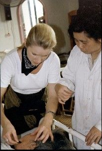 Es war eine große Umstellung von europäischer Haut auf chinesische. Ich musste mir andere Stichtechniken aneignen, welche ich in jeder noch freien Minute an meinem Wattebausch (extra von Studenten angefertigt) übte. Anmerkung: Im Vergleich zu uns müssen die chinesischen Studenten 1 Jahr lang an einem Wattebausch ihre Stichtechniken perfektionieren bevor sie das erste Mal an einem Patienten stechen dürfen.